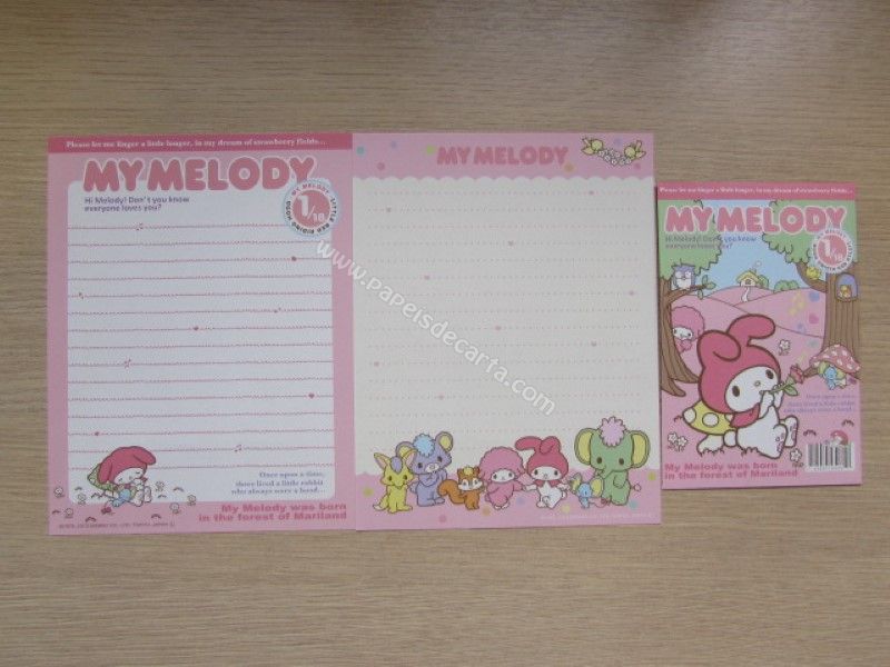 Conjunto importado, de papel de carta da My Melody, com 2 folhas diferentes e 1 envelope, da Sanrio. Fabricante: Sun-Star.