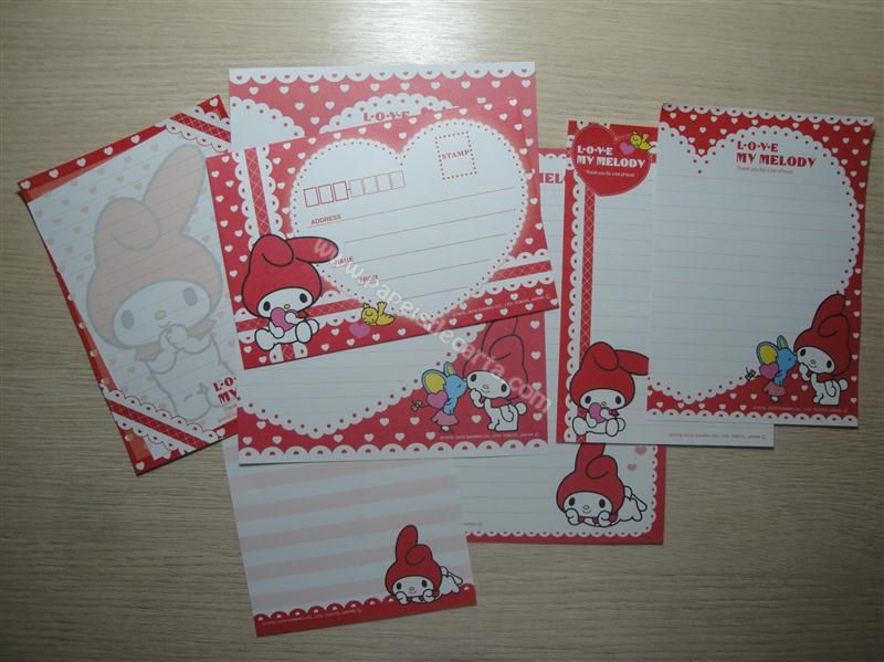 Conjunto importado, de papel de carta com 2 folhas diferentes, 4 notinhas diferentes e 1 envelope da My Melody.