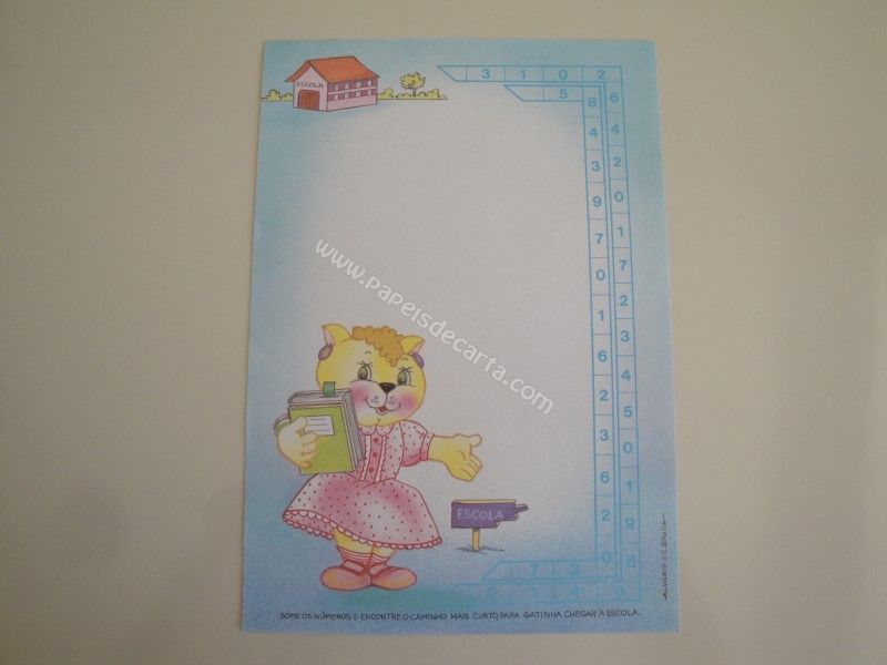 Papel de carta antigo, tamanho médio, da coleção Álvaro de Sousa com uma gatinha querando encontrar o caminho mais curto para a escola. Frase: Some os números e encontre o caminho mais curto, para gatinha chegar à escola.