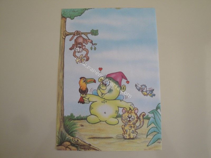 Papel de carta antigo, tamanho médio, da coleção Álvaro de Sousa com um monstrinho verde brincando com seus amigos.