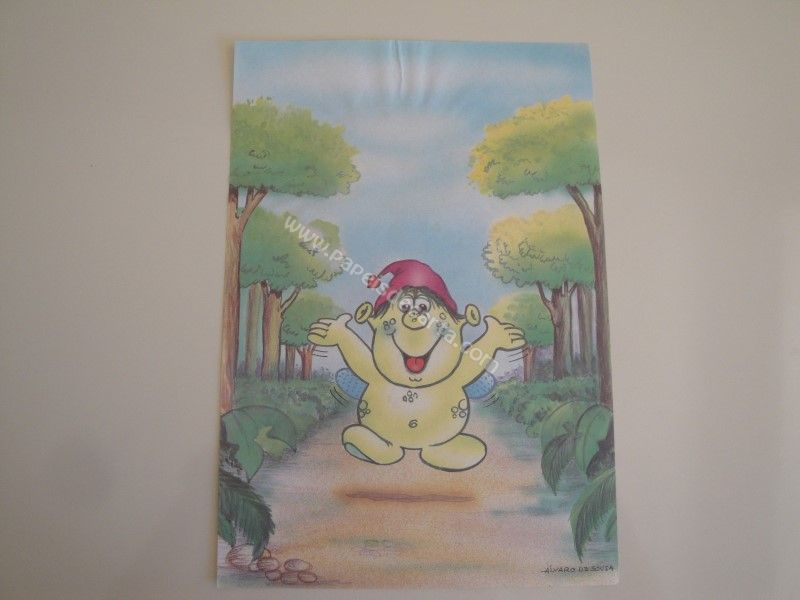Papel de carta antigo, tamanho médio, da coleção Álvaro de Sousa com um monstrinho verde andando alegremente pela floresta. Obs: O papel está um pouco amassado.