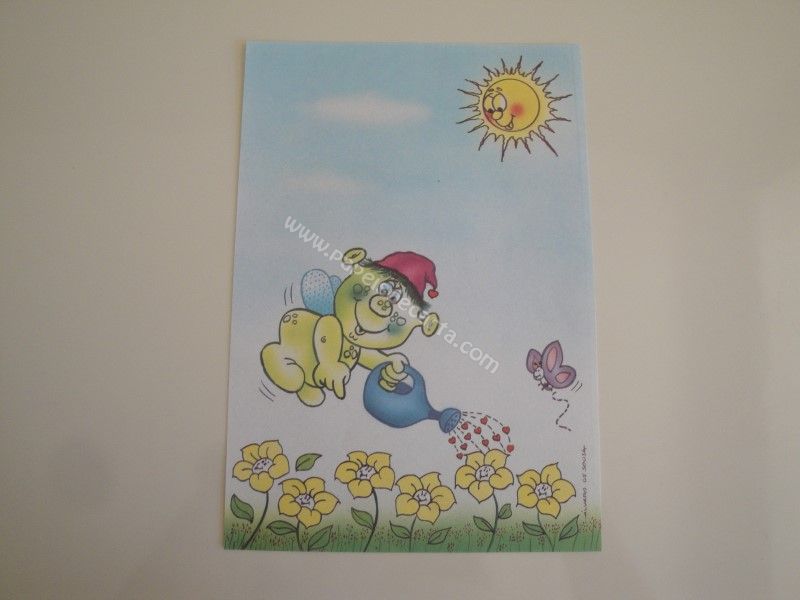Papel de carta antigo, tamanho médio, da coleção Álvaro de Sousa com um monstrinho verde regando as flores do jardim.