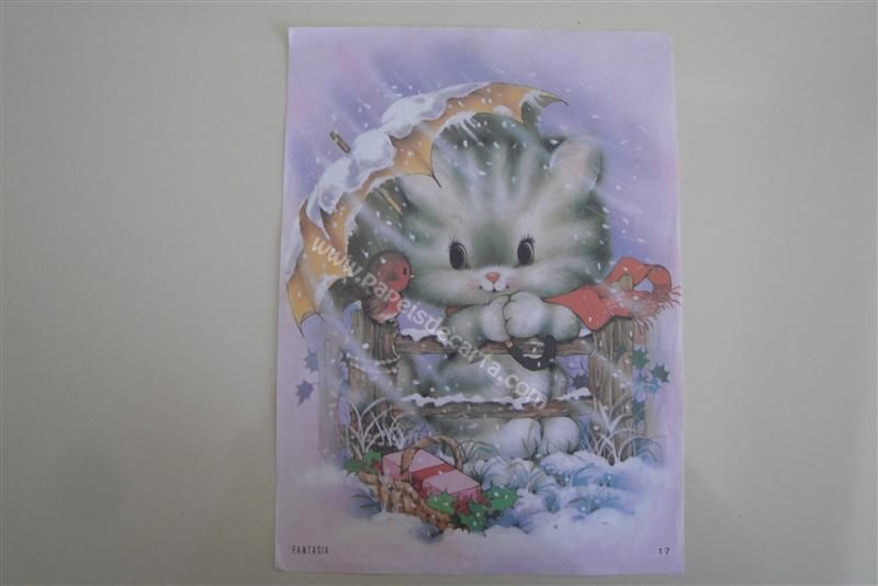 Papel de carta Fantasia - Natal - nº 17 - Um gatinho segurando um guarda-chuva, junto com um passarinho em meio à uma chuva de neve.