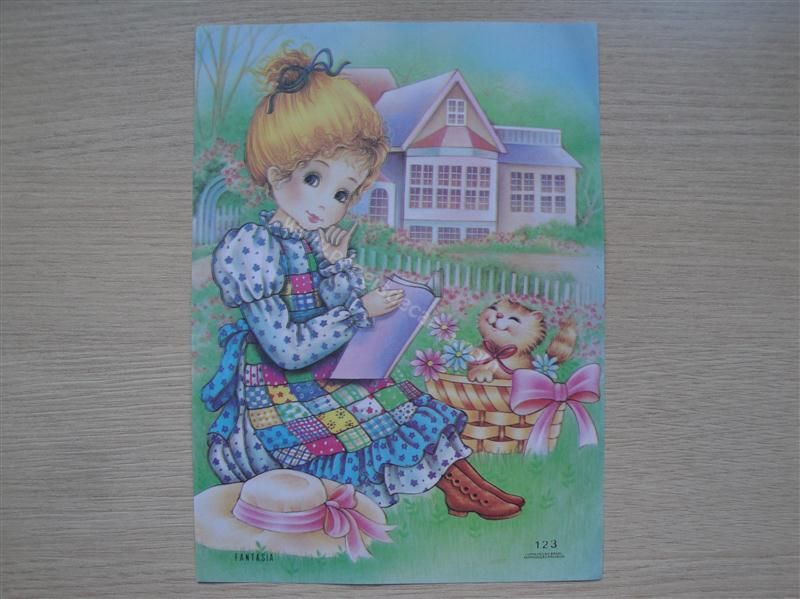 Papel de carta fantasia nº 123 - Uma menina sentada no jardim de sua casa, lendo um livro enquanto sua gatinha, que está na cesta de flores, sorri