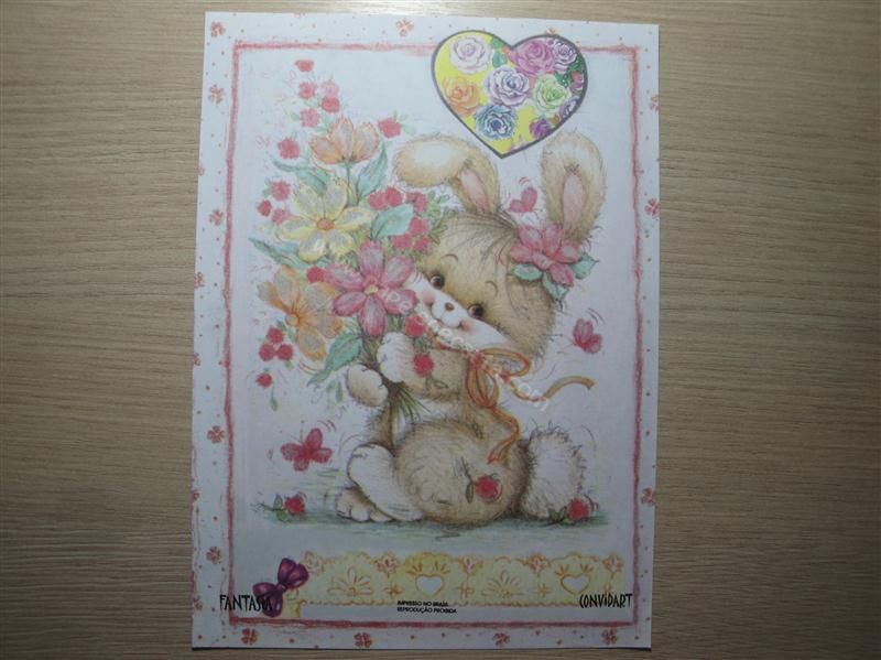 Papel de carta fantasia sem número - Coelhinho carregando um bouque de flores