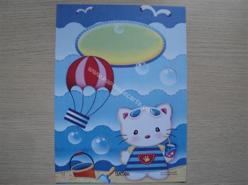 Papel de carta fantasia 73 - Gatinha que parece a Hello Kitty, na praia, tomando um refresco. Obs.: Esse papel possui o mesmo desenho do 48.