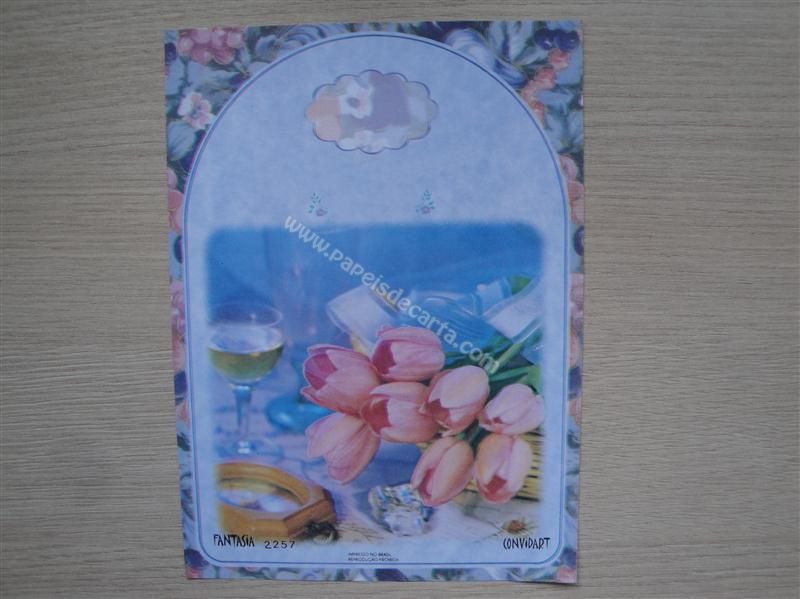 Papel de carta fantasia nº 2257 - Uma taça de vinho branco e um lindo bouquê de tulipas rosas.