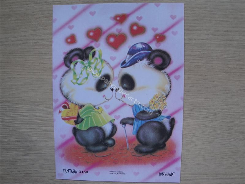 Papel de carta fantasia nº 2138 - Um casal de ursinhos panda namorando e prestes a se presentear.
