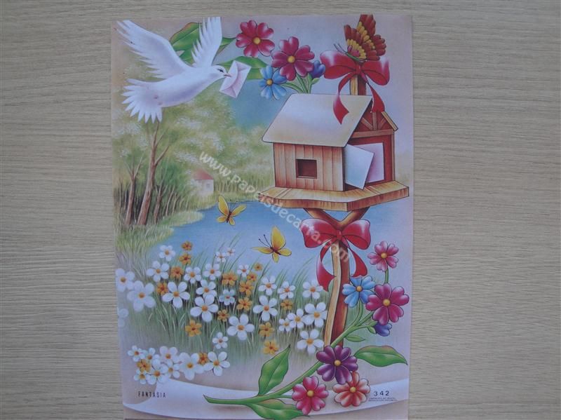 Papel de carta fantasia nº 342 - Uma pombinha branca levando um envelope até uma caixa de correspondências próxima a um lago, com muitas árvores, flores e borboletas envolta.