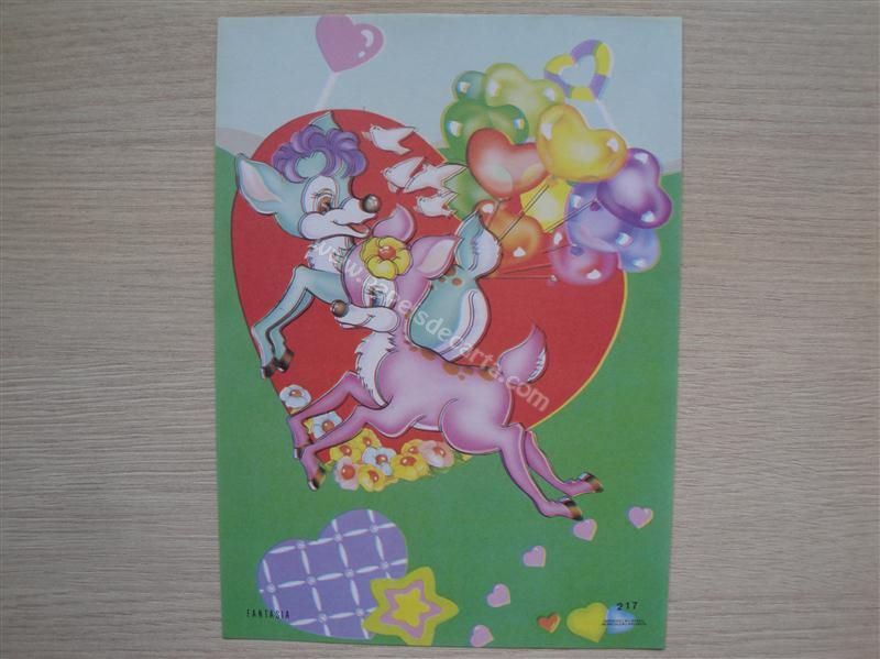 Papel de carta Fantasia nº 217 - Um casal de animais saltitando com passarinhos voando e balões coloridos de coração.