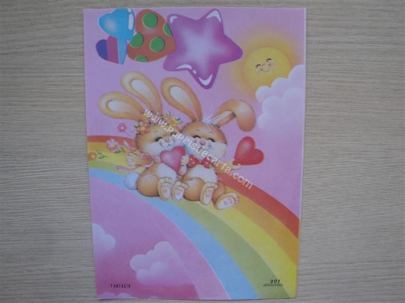 Papel de carta fantasia nº 207 - Um casal de coelhinhos escorregando no arco-íris.