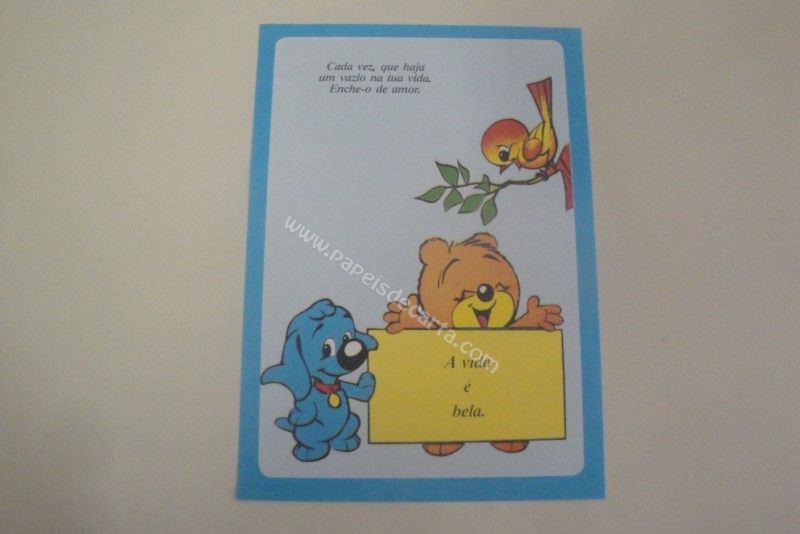 Papel de carta antigo, tamanho médio, raro, da coleção "Borda Azul". Frase 1: Cada vez, que haja um vazio na tua vida. Enche-o de amor. Frase 2: A vida é bela.
