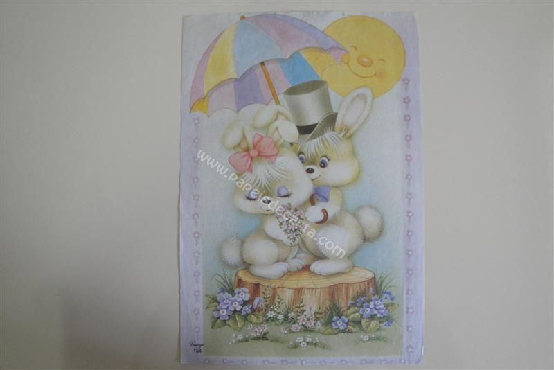 Papel de carta grande Cartiuge - 134 - Um casal de coelhinhos sob um tronco de árvore com uma sombrinha em um dia de sol. Obs: Papel um pouco amassado.