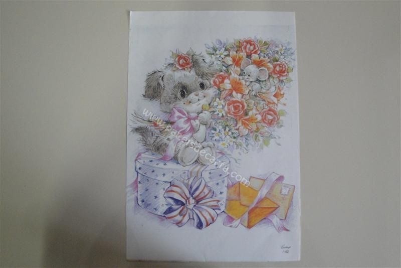 Papel de carta grande Cartiuge - 142 - Uma cachorrinha sentada sob um pacote de presentes e observando um ratinho entre as flores.