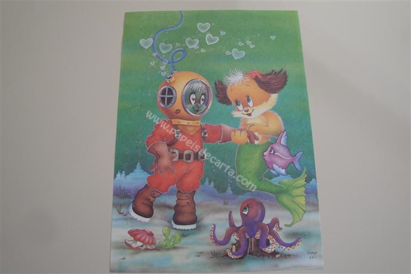 Papel de carta antigo, raro, tamanho médio, Cartiuge - 381. Um mergulhador de mãos dadas com uma sereia cachorra.