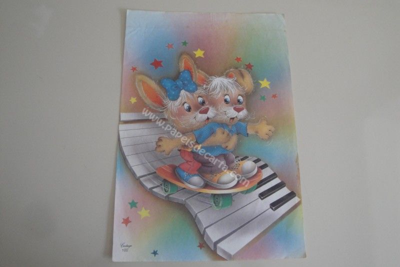 Papel de carta grande Cartiuge - 122 - Um casal de coelhos andando de skate sob um teclado de piano. Obs: Papel um pouco amassado.