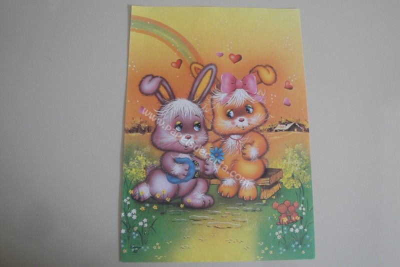 Papel de carta grande Cartiuge - 82 - Um coelhinho roxo entregando uma flor azul para uma coelhinha laranja enquanto um casal de ratinhos observa. No fundo se vê um arco-íris.