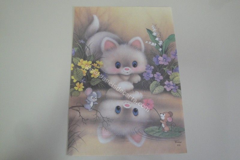 Papel de carta grande Cartiuge - 113 - Uma gatinha olhando seu reflexo no rio enquanto um ratinho lhe oferece uma flor.