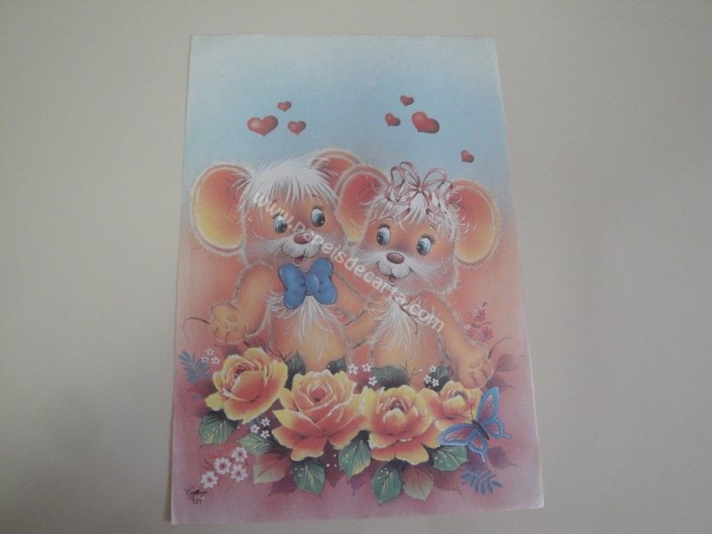 Papel de carta antigo, tamanho grande, da coleção Cartiuge, número 121 - Um casal de ratinhos apaixonados observando as flores e uma borboleta.