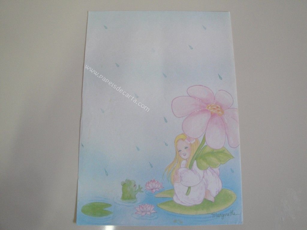 Papel de carta antigo, raro, tamanho médio, da coleção Margarethe - sem número. Ilustração: Uma menina ajudando um sapinho no lago. Tamanho: 15,0 x 21,0 cm