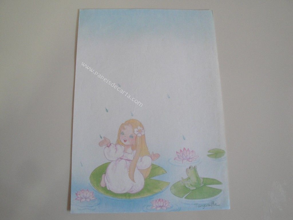 Papel de carta antigo, raro, tamanho médio, da coleção Margarethe - sem número. Ilustração: Uma menina e um sapo sentindo a garota no lago. Tamanho: 15,0 x 21,0 cm