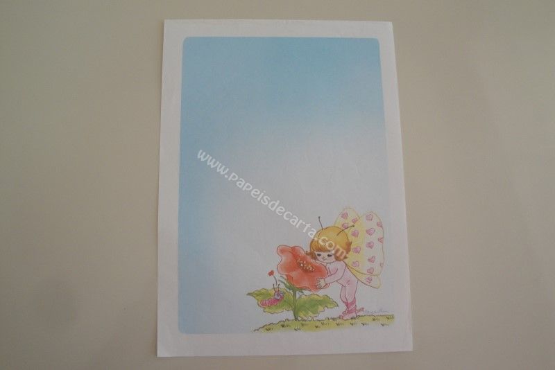 Papel de carta antigo, raro, tamanho médio, da coleção Margarethe - sem número. Ilustração: Uma menina borboleta, cheirando uma flor. Tamanho: 15,0 x 21,0 cm