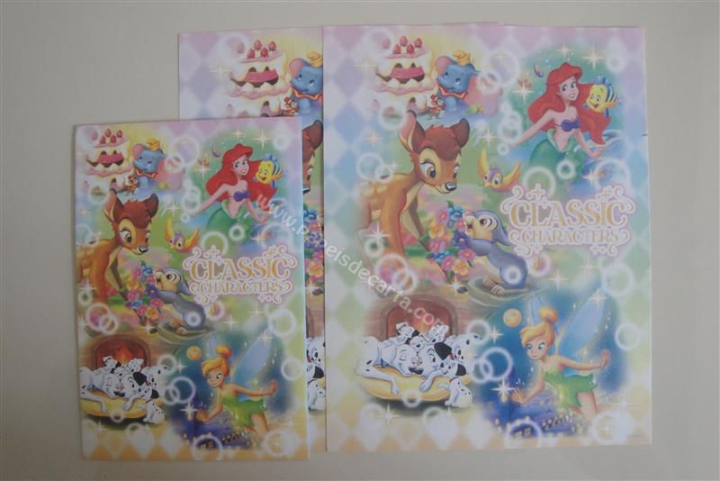 Conjunto importado, de papel de carta com 2 folhas iguais, 1 notinha e 1 envelope do Disney Classic Characters com o Bambi (e Tambor), o Dumbo, os Dalmatas, a Pequena Sereia (Ariel e Linguado) e a Sininho (Tinker Bell).