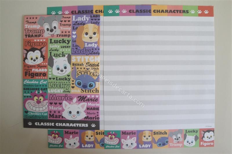 Conjunto importado, de papel de carta com 2 folhas iguais, 1 notinha e 1 envelope do Disney Classic Characters com a Dama (Lady), o Vagabundo (Tramp), o Figaro, o Lucky, o Stitch, o Gato Risonho (Cheshire Cat) e a Marie.