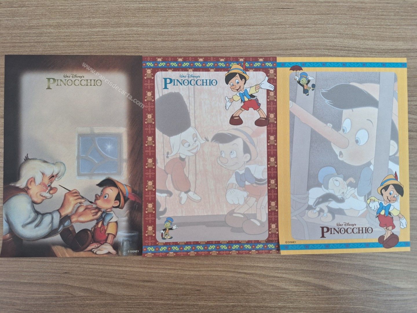 Lote com 3 papéis de carta importado, do Pinocchio, tamanho pequeno da Disney.