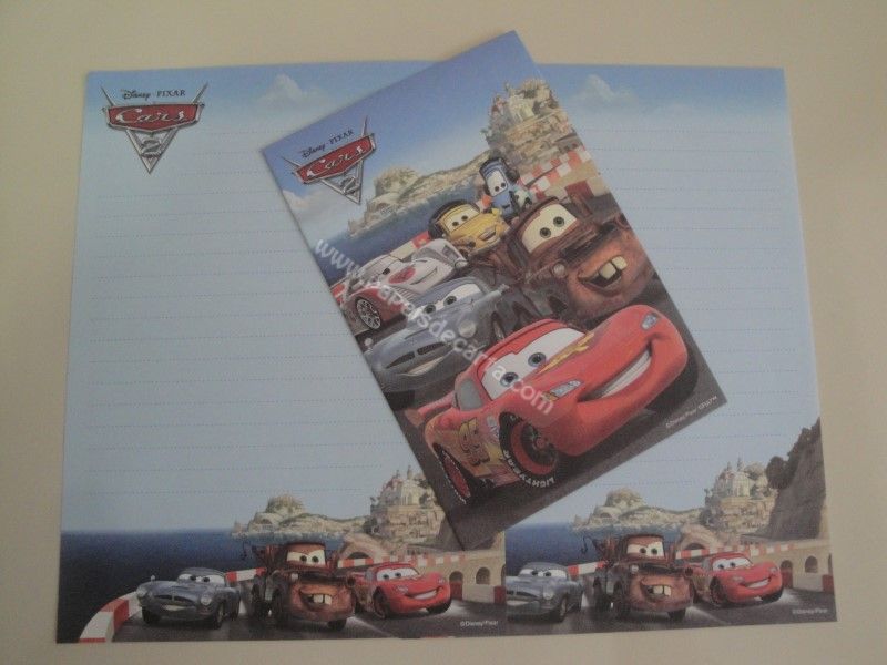 Conjunto importado, de papel de carta do Cars (Carros), da Disney, com 2 folhas iguais e 1 envelope.