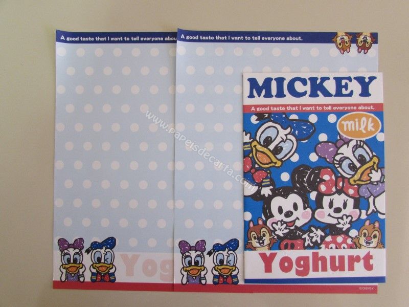 Conjunto importado, de papel de carta com 2 folhas iguais e 1 envelope do Mickey and Friends, com o Mickey, a Minnie, a Miss Daisy (Margarida), o Donald Duck (Pato Donald) e o Chip & Dale (Tico e Teco).