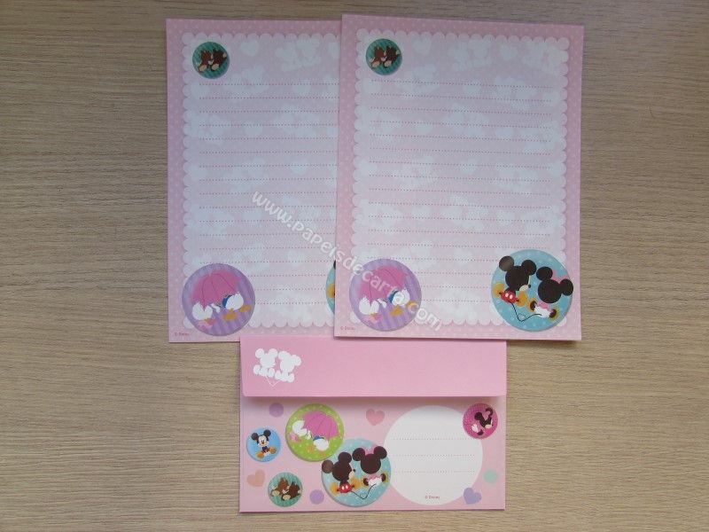 Conjunto importado, de papel de carta com 2 folhas iguais e 1 envelope do Mickey and Friends, com o Mickey, a Minnie, a Miss Daisy (Margarida), o Donald Duck (Pato Donald) e o Chip and Dale (Tico e Teco). Fabricante: Sun-star.