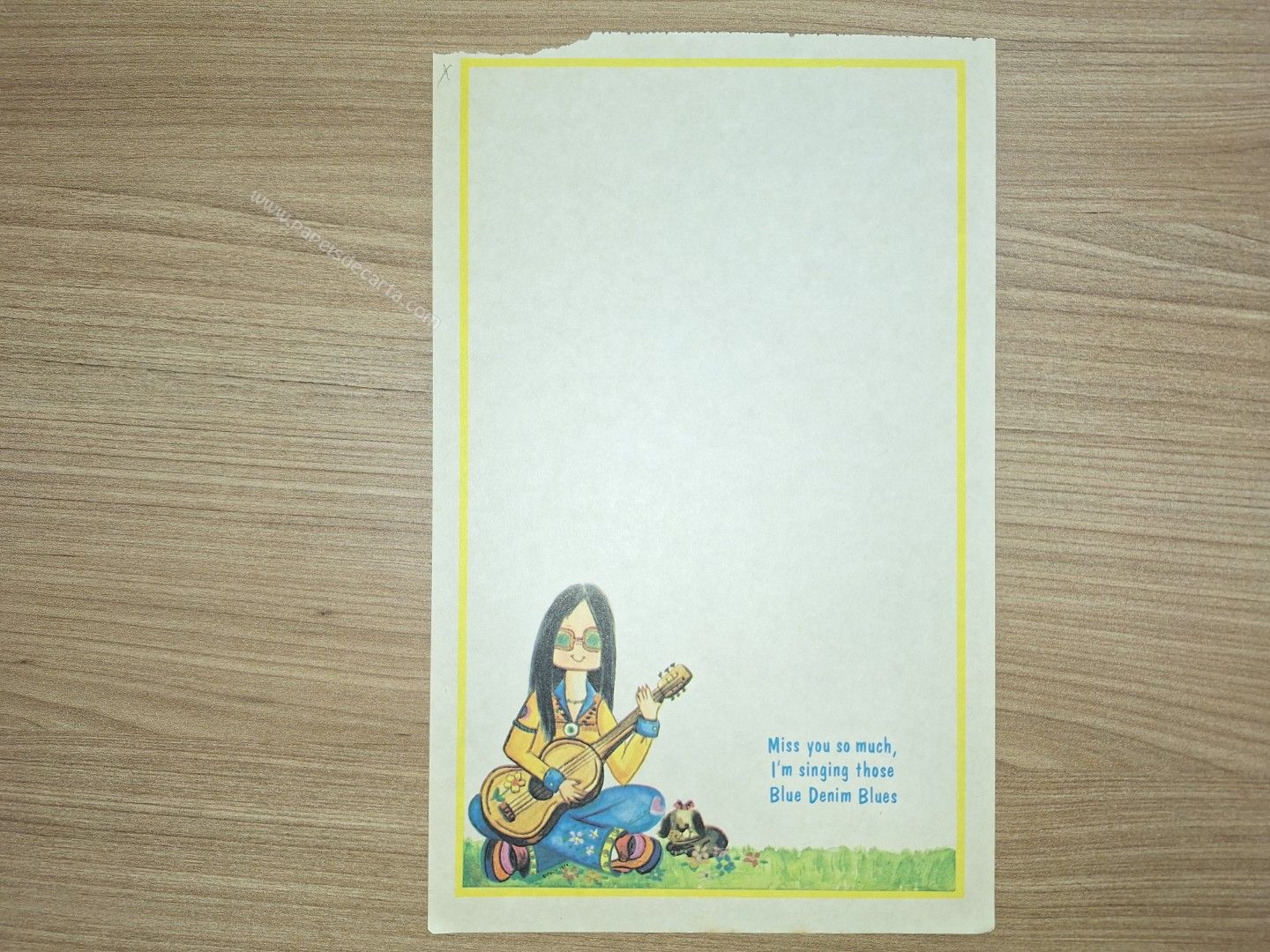 Papel de carta antigo, tamanho médio, da coleção BLUE DENIM. ** O PAPEL ESTÁ RASGADO NA PONTINHA E TEM UM "X" FEITO DE LÁPIS NA BORDA DO PAPEL. VER FOTO. **
