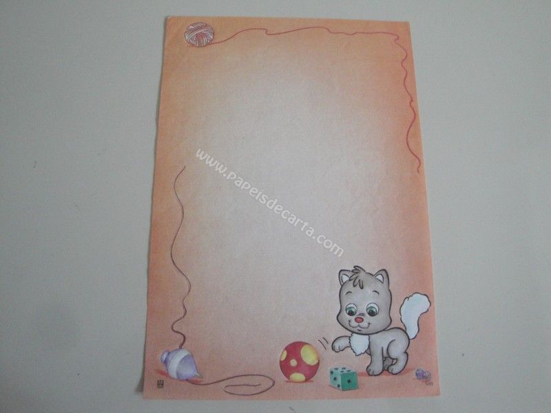 Papel de carta antigo, raro, tamanho médio, da coleção CBEC - 5165. Um gatinho brincando com uma bola, um peão e um dado.