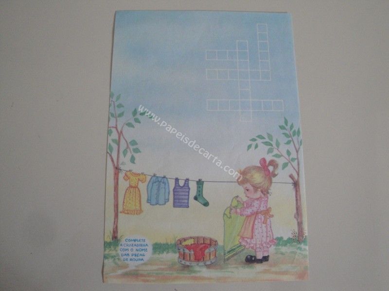 Papel de carta antigo, raro, tamanho médio, de coleção não identificada, para atividades. Atividade: Complete a cruzadinha com o nome das peças de roupa.