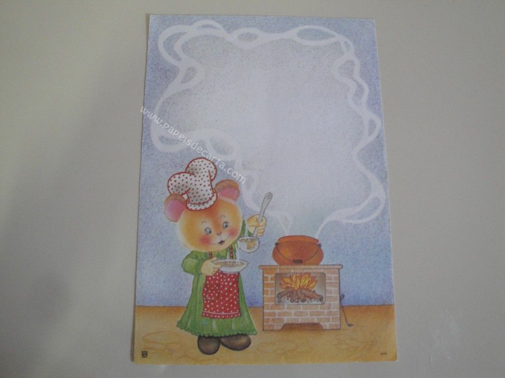 Papel de carta antigo, raro, tamanho médio, da coleção CBEC - 5179. Uma ursinha cozinhando em um fornão a lenha.