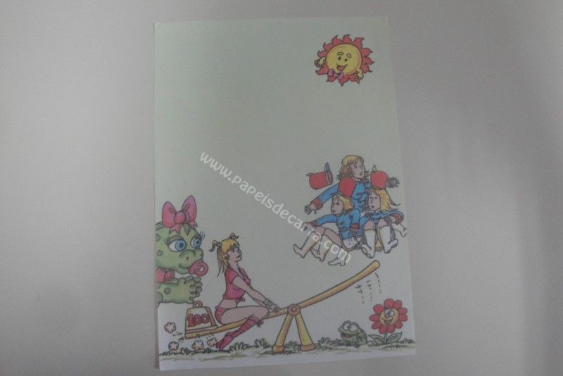 Papel de carta antigo, raro, tamanho médio, da coleção Xuxa, sem numeração, com a Xuxa brincando na gangorra com as paquitas.