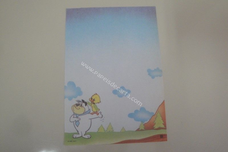 Papel de carta antigo, raro, tamanho médio, da coleção CBEC - sem número, com um pintinho pousado no braço de um cachorro.