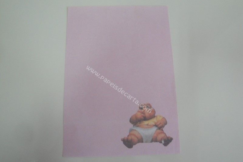 Papel de carta antigo, tamanho médio, da coleção Família Dinossauro, sem numeração. Papel de carta rosa com o Baby cutucando o nariz.