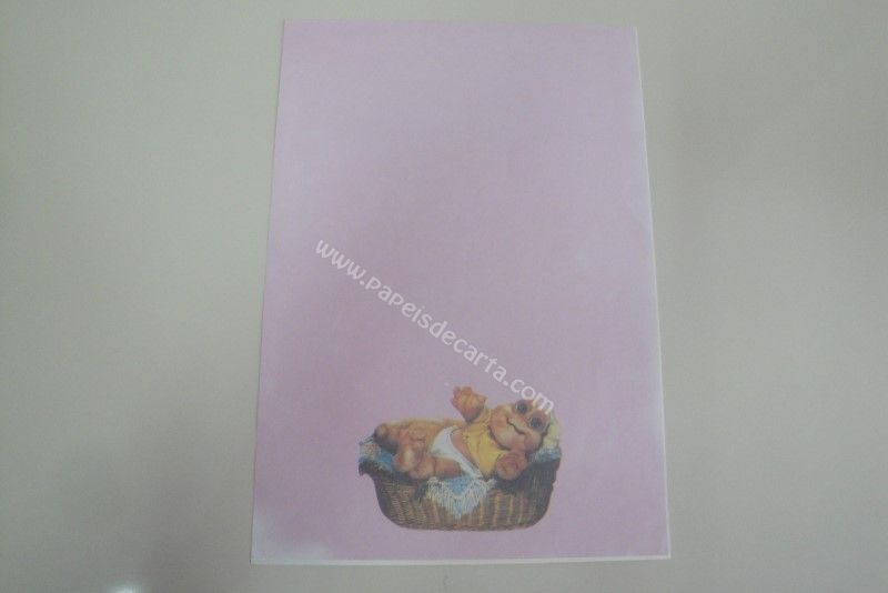 Papel de carta antigo, tamanho médio, da coleção Família Dinossauro, sem numeração. Papel de carta rosa com o Baby deitado em um cesto.