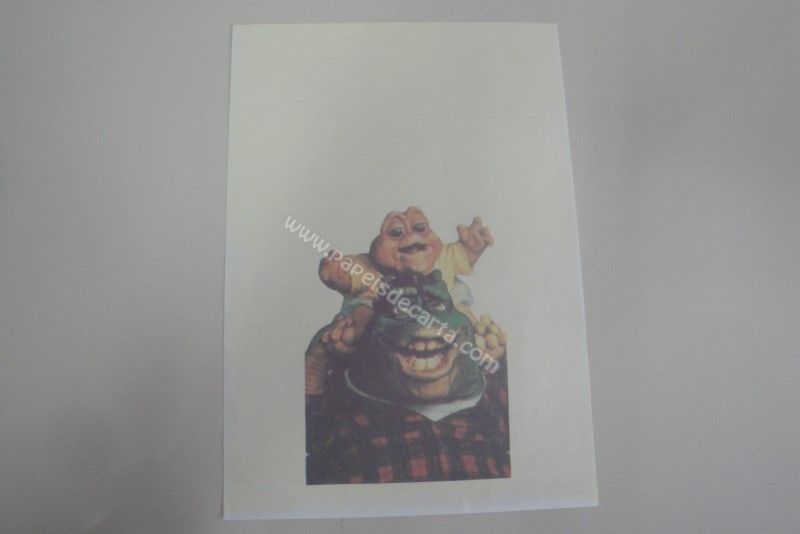 Papel de carta antigo, tamanho médio, da coleção Família Dinossauro, sem numeração, com o Baby andando de cavalinho no Dino.