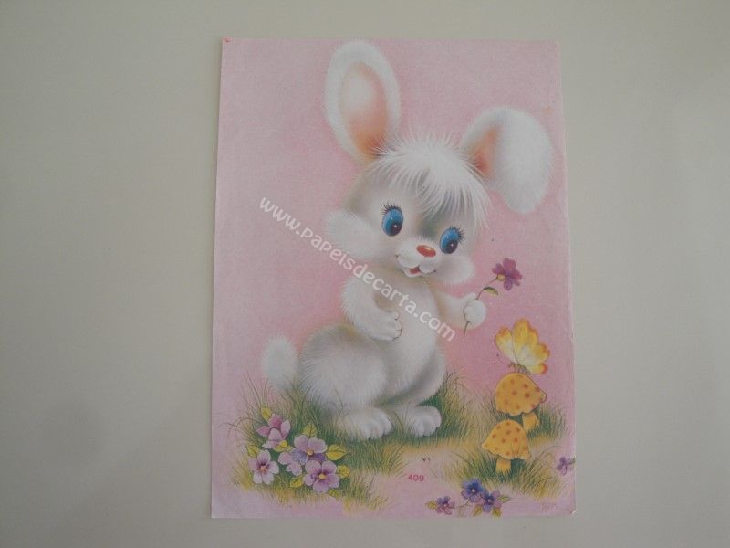 Papel de carta antigo, tamanho médio, da coleção Tom, número 409, com uma coelhinha segurando uma flor.