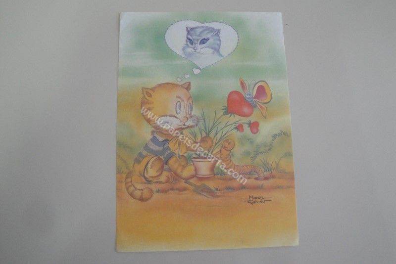 Papel de carta antigo, tamanho médio, da coleção Moacir Galvão - sem número. Ilustração: Um gatinho plantando uma flor enquanto pensa no seu amor... Tamanho: 15,0 x 21,0 cm