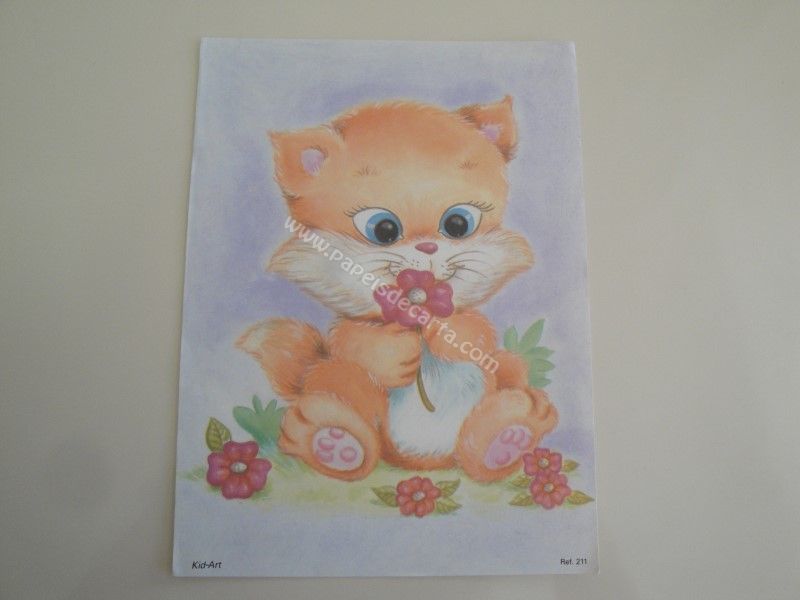 Papel de carta antigo, raro, tamanho médio, da coleção Kid-Art - 211. Ilustração: Uma linda gatinha segurando uma flor. Tamanho: 15,5 x 21,5 cm