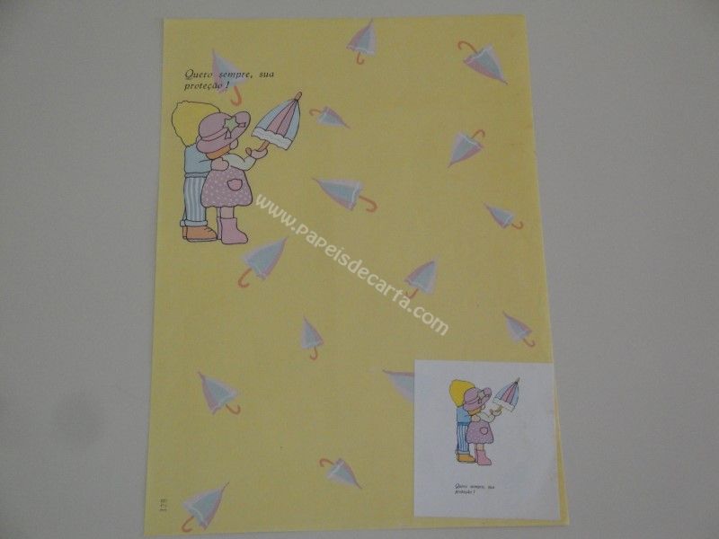 Papel de carta antigo, tamanho médio, da coleção Escondidinhos, com numeração 128. Tem um adesivo do mesmo desenho colado no papel.
