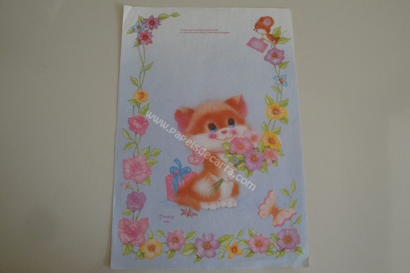 Papel de carta antigo, raro, tamanho grande, Sorria - 046 - Um gatinho segurando um buquê de flores. Frase: O amor sem sacrifício é uma ilusão e o sacrifício sem amor é uma impossibilidade.