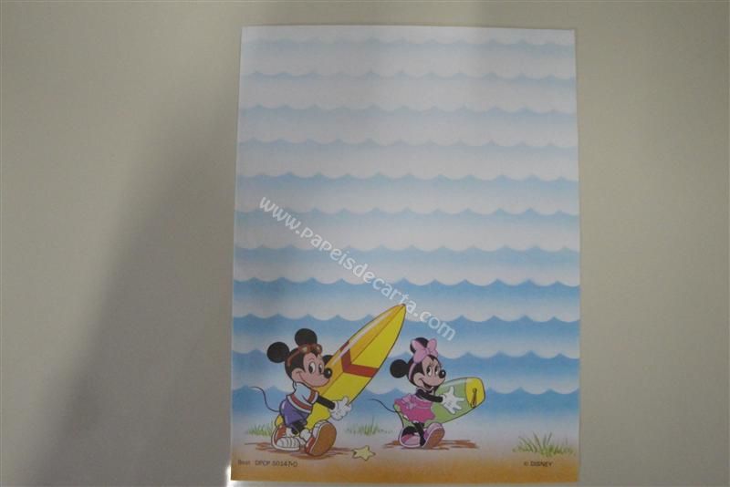 Papel de carta antigo, raro, tamanho médio, Disney, com o Mickey e a Minnie na praia indo surfar.