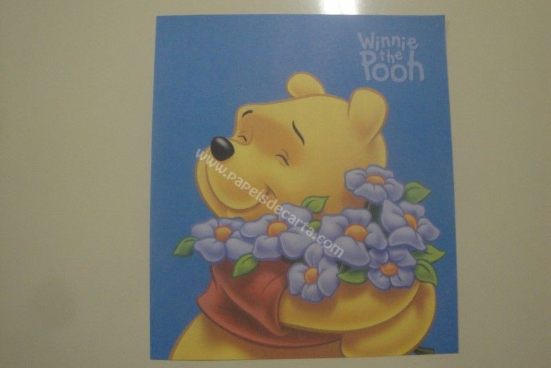 Papel de carta antigo, raro, tamanho pequeno (notinha / memo), da Disney, com o Ursinho Pooh segurando algumas flores azuladas.