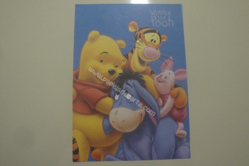 Papel de carta antigo, raro, tamanho médio, da Disney, com o Ursinho Pooh, o Leitão, o Tigrão e o Ió abraçados.