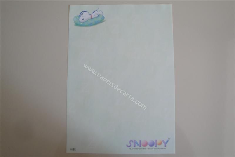 Papel de carta grande do Snoopy. Papel verde claro, com o Snoopy dormindo em uma almofada azul na parte superior esquerda.
